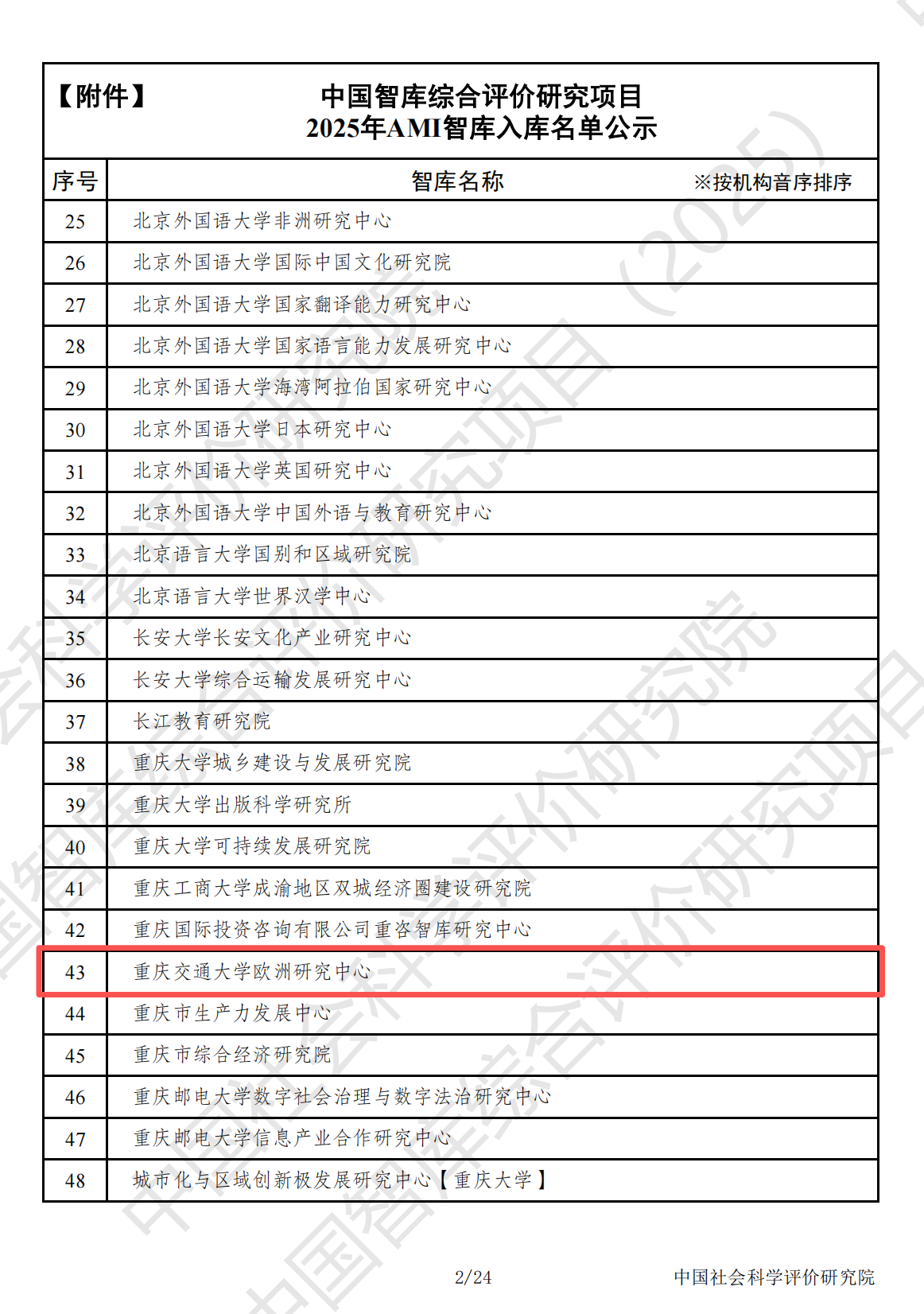 2025年7月25日,中国社会科学评价研究院公示了“中国智库综合评价研究项目(2025)”AMI智库入库名单,重庆交通大学欧洲研究中心凭借在区域国别研究领域的突出表现,成功入选。