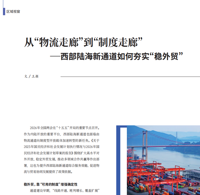 近日,欧洲研究中心兼职研究员王颖教授在行业期刊《中国对外贸易》(2026年第3期)发表署名文章《从“物流走廊”到“制度走廊”—西部陆海新通道如何夯实“稳外贸”》。文章围绕西部陆海新通道的发展转型展开,指出在“十五五”开局之年,通道建设已从初期的“物流走廊”阶段,迈向以制度供给为核心的“制度走廊”新阶段,系统分析了当前制度供给的不足,并提出构建三层制度体系,为提升西部陆海新通道综合服务效能提供了务实建议。